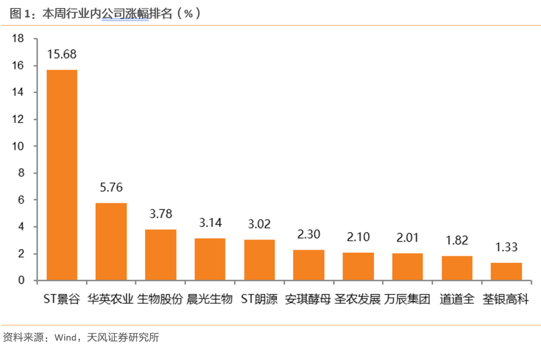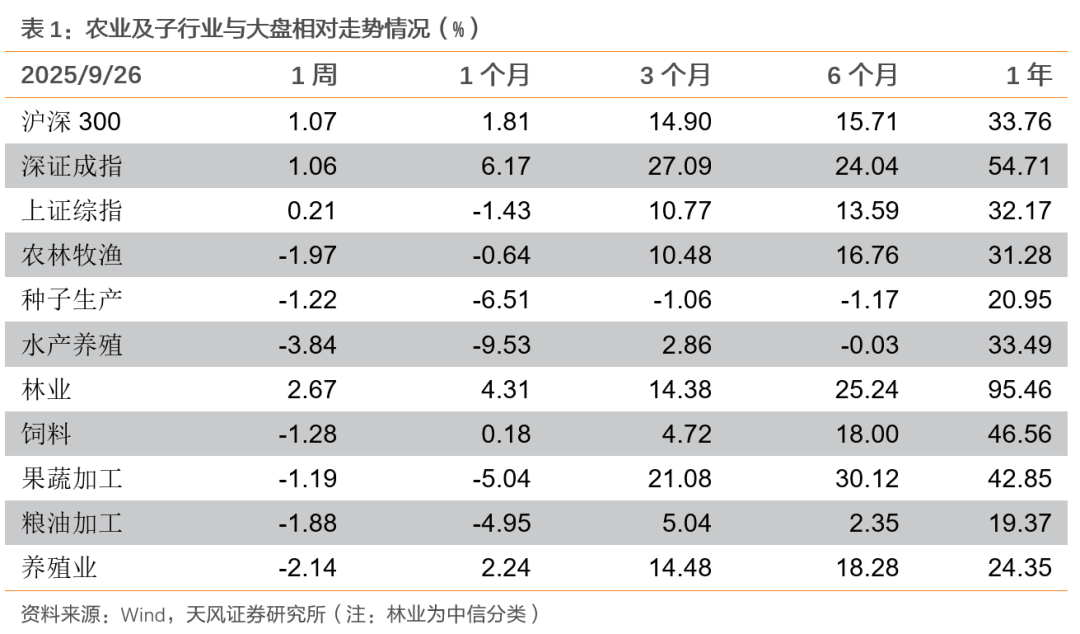 最新交易周(2025年9月22日-2025年9月26日),农林牧渔行业-1.97%,同期上证综指、深证成指、沪深300变动分别为+0.21%、+1.06%、+1.07%。个股中涨幅靠前的分别为:ST景谷+15.68%、华英农业+5.76%、生物股份+3.78%、晨光生物+3.14%、ST朗源(维权)+3.02%、安琪酵母+2.30%、圣农发展+2.10%、万辰集团+2.01%、道道全+1.82%、荃银高科+1.33%。