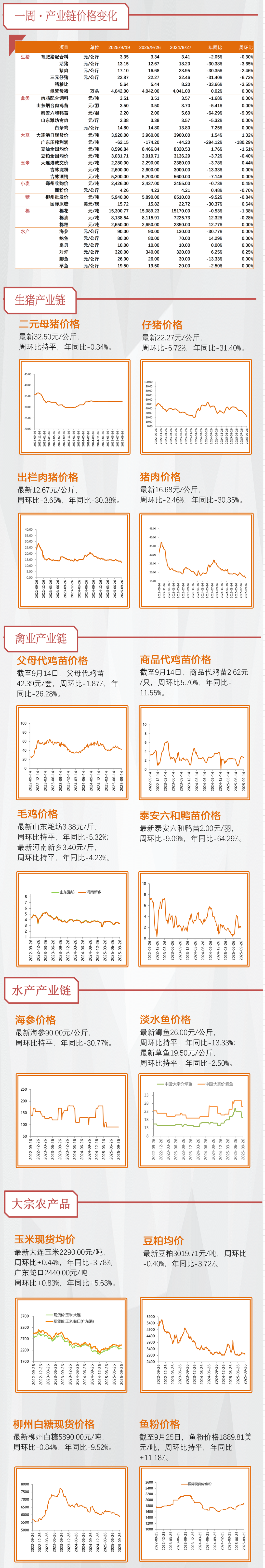 ②本周鸡苗、毛鸡价格环比持平。截至9月27日,山东大厂商品代苗报价3.6元/羽(取区间中值),较上周末持平;山东区域主流毛鸡均价3.35元/斤,较上周末持平(数据来源:家禽信息PIB)。受制于毛鸡价格影响,苗价下调至养户降低成本的心理价位,补栏情绪略有提升,整体养殖端议价情绪高涨。但规模场按计划补栏,对种禽企业形成有利支撑。